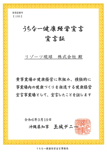 リゾーツ琉球は、経営理念である「全社員の物心両面の幸福の追求」の実現に向け、従業員の心身の健康を重要な経営課題と位置付けています。2024年3月には、沖縄県が推進する「うちなー健康経営宣言」を行い、沖縄県より宣言証の交付を受けました。