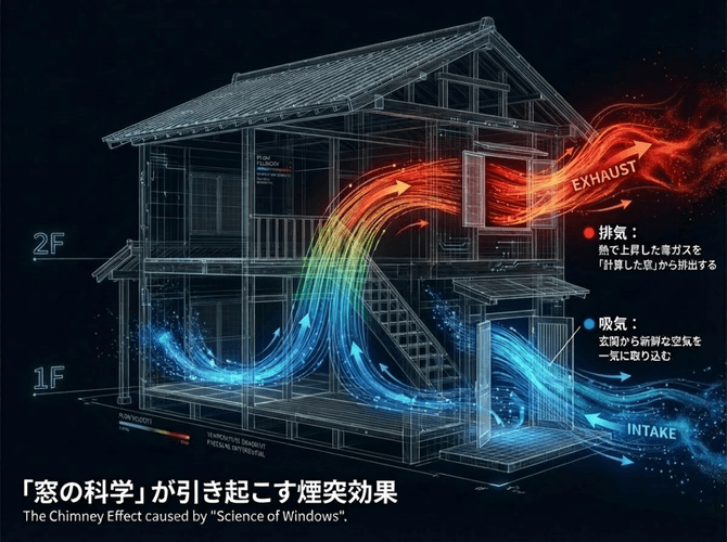 核心は「窓の科学」——住宅の間取りと窓配置を、**火災動力学シミュレーター**を用いて科学的に解析し、自然対流の力を最大化する開口部配置を設計する技術である。