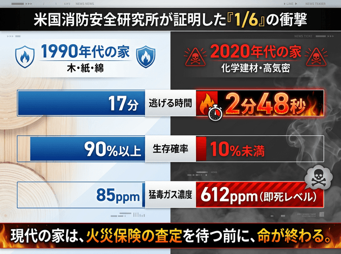 さらに、現代住宅に標準装備された「高気密・高断熱」仕様が、皮肉にも有毒ガスを家内部に封じ込める構造となっている。加えて、高断熱住宅では火炎伝播速度が急激に高まることが米国消防安全研究所(2024年公開データ)の実験でも明らかになっている。