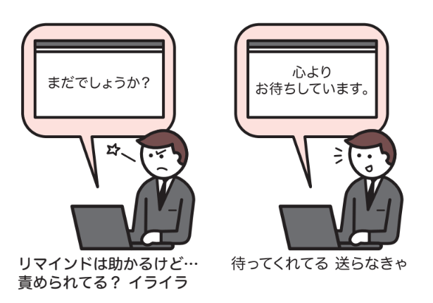 △ 「まだでしょうか?」とリマインド 〇 「念のため」&「お待ちしています」