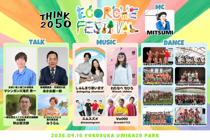 MCにMITSUMI(ラジオDJ/かながわSDGsスマイル大使)を迎え、豪華ゲストによる環境問題をテーマにしたトークセッションや音楽ライブ、地元ダンスチームによるパフォーマンスなど、多彩なステージプログラムを開催します。