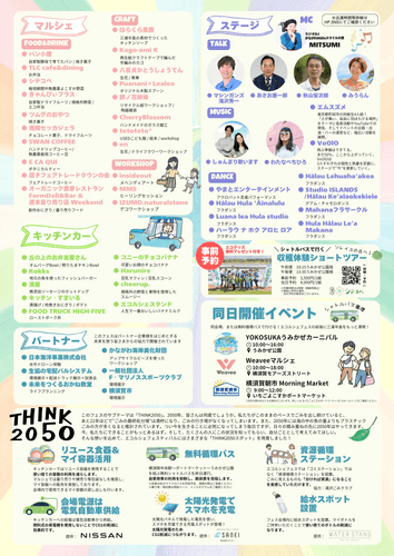 マイ容器を持参して楽しむマルシェや、電気自動車からの給電で運営するキッチンカーなど、環境に配慮した新しいフェスの形を提案。マルシェ&キッチンカー計30店舗の出店に加え、音楽ライブや環境トーク、水中ドローン体験など、多彩なコンテンツを通して「2050年の未来環境」を楽しみながら考えるイベントです。