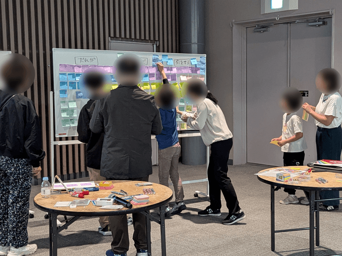 ワークショップでは「ふせん紙」と「ペン」という最小限の道具を使ったアイデア出しから始まり、出されたアイデアを組み替えたり、つなげたりしながら次のアイデアへと発展させていくプロセスを実践しました。一見すると関連がなさそうな単発のアイデアが、少しずつつながり、形になっていく様子を目にすることで、参加者は「楽しさ」と「学び」を同時に体験できました。