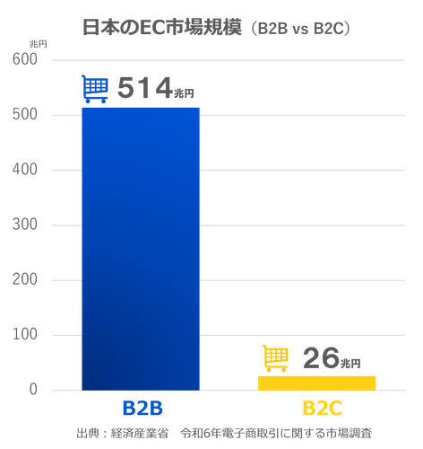 経済産業省の市場調査*1によると、日本のB2B EC市場規模は約514兆円に達し、B2C EC市場は約26兆円となり、B2B ECはB2C ECの約20倍の規模となっています。