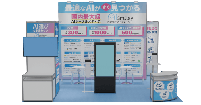 会場では、最新のAIソリューションやニュース等を集めるAIポータルメディア「AIsmiley」活用方法のご案内と、AI導入のご相談を受け付けております。皆さまのご来場を心よりお待ちしております。