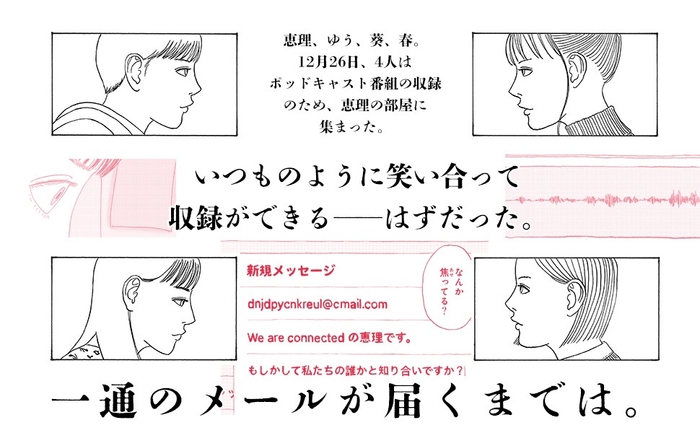 12月26日、4人はポッドキャスト番組の収録のため、恵理の部屋に集まった。性格は違っても、いつものように笑い合って収録ができる——はずだった。恵理の元に一通のメールが届くまでは。