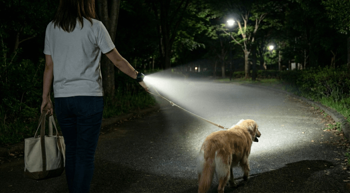 従来の懐中電灯は手に持つ必要があり、複数のアイテムを同時に扱う場面では利便性に課題がありました。特に愛犬との夜間散歩では、リード・荷物・ライトで両手が塞がってしまうという問題が長年にわたり未解決でした。本製品の開発は、こうした日常生活における実際の不便さに着目したことがきっかけとなっています。