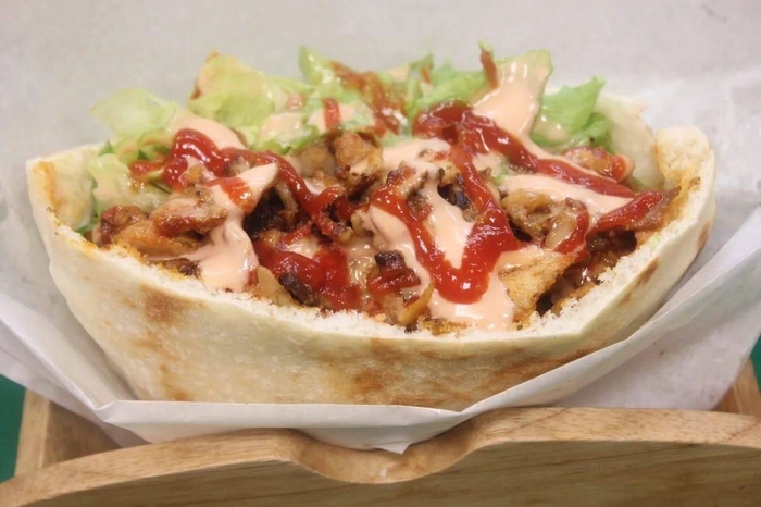 焼きたてのチキンとサラダをピタパンにサンドし、お好きな自家製ソースをトッピングした当店一番人気のケバブサンド。