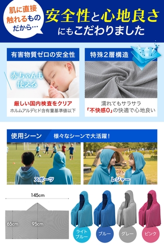 また、特殊な2層構造生地により、水に濡らして羽織っても衣服にベタっと張り付かず、常にサラサラで心地よい着用感を実現しました。