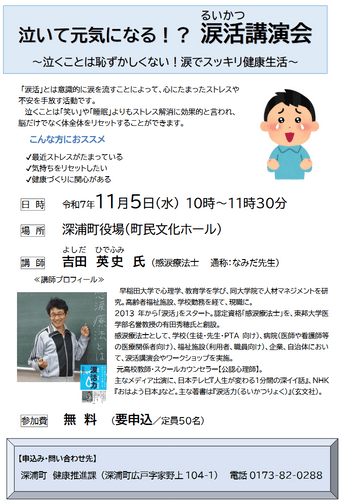 【青森県深浦町】泣いて元気になる!涙活講演会~泣くことは恥ずかしくない!涙でスッキリ健康生活~
