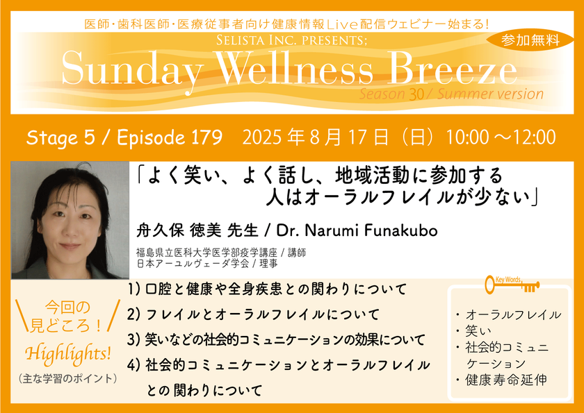 《医師・歯科医師・薬剤師向け》無料オンラインセミナー8/17(日)朝10時開催『よく笑い、よく話し、地域活動に参加する人はオーラルフレイルが少ない』舟久保 徳美 先生(福島県立医科大学医学部疫学講座/講師)