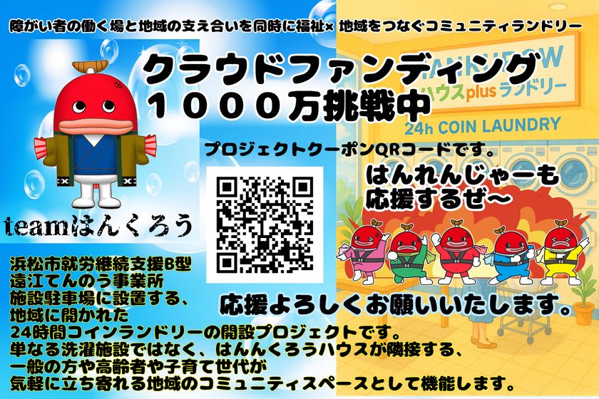 静岡県浜松市の地域のコミュニティスペースの新設を目指したはんくろうランドリー誕生プロジェクトを8月2日まで実施!