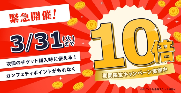 【全会員対象】エンタメチケットサイト「カンフェティ」 ポイント10倍キャンペーン 3月末までの限定開催