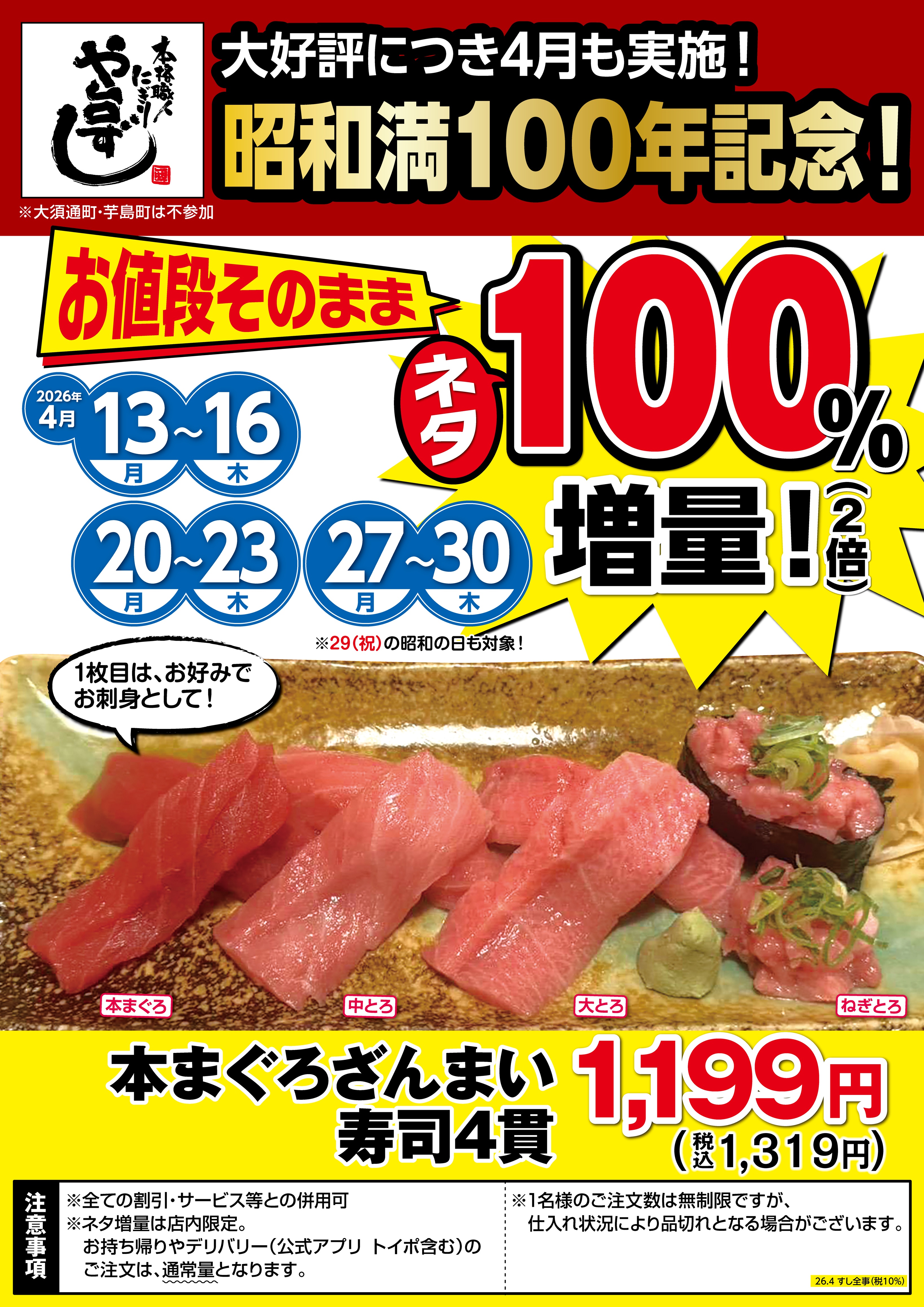 昭和満100年を記念して!本格職人握り寿司居酒屋「や台ずし」が本まぐろざんまい寿司4貫のネタ100%増量キャンペーンを税込1,319円で2026年4月13日(月)~16日(木)、20日(月)~23日(木)、27日(月)~30日(木)の計12日間限定実施!